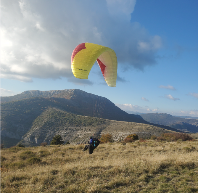 Satisfaits de ce premier vol, les Vertacos rejoignent les pilotes locaux pour le vol du soir sur un site plus exotique, offrant un terrain de jeu exceptionnel avec le Ventoux en fond de décor. Le vent soutenu impressionne un peu, mais chacun finit par se mettre en l’air dans des conditions laminaires et agréables. Entre reposés au déco, gonflage et jeux au sol, chacun profite à sa manière de ce moment suspendu, avant un long glide vers la vallée ou, pour les plus audacieux, un atterrissage directement au gîte !