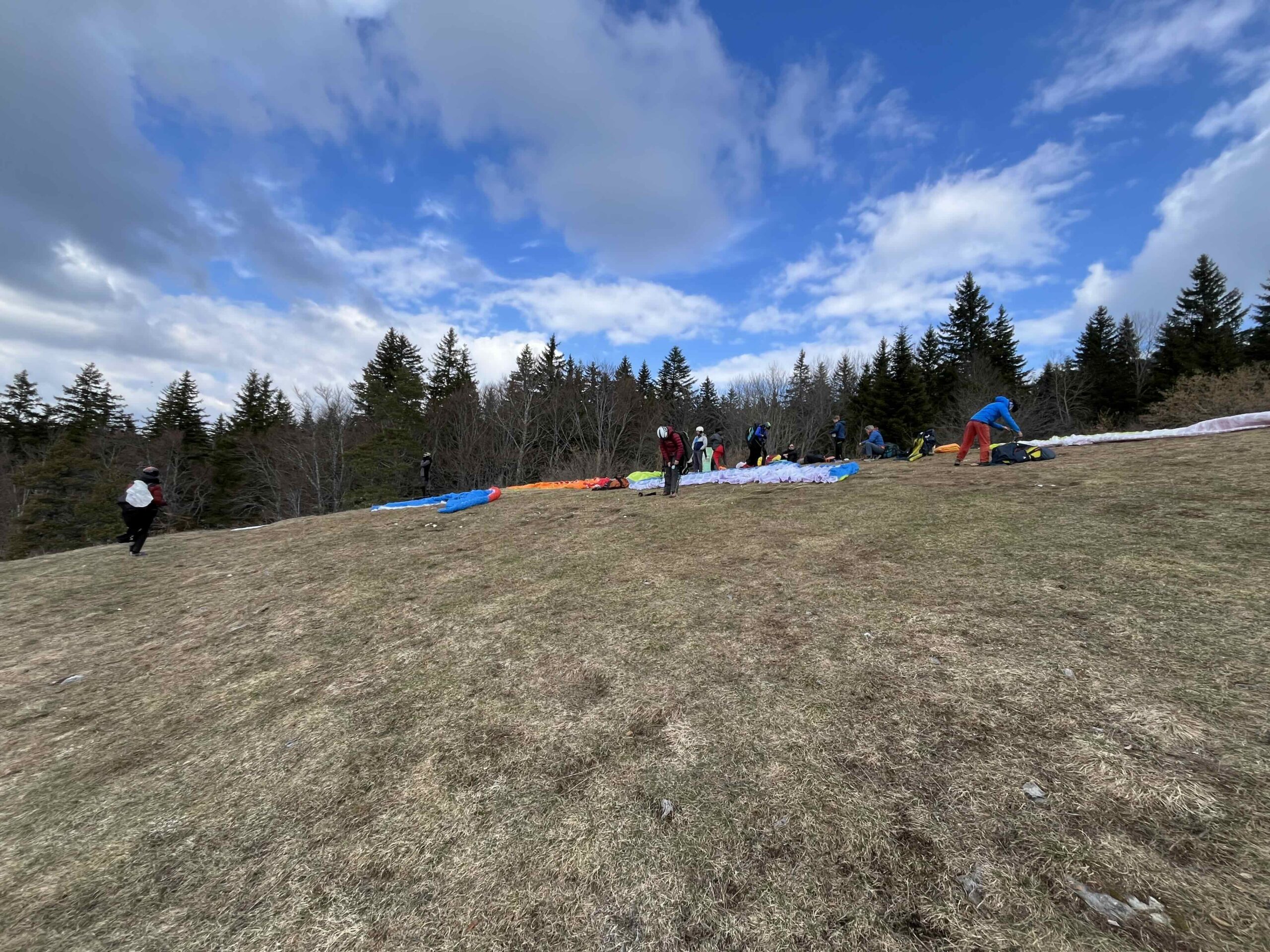 Une fois les têtes et les estomacs bien remplis, modulo quelques chassés-croisés de pilotes, une équipe s’est concentrée sur la pratique du gonflage à l’aigle et une autre d’une quinzaine de pilotes s’est retrouvée au décollage du Belvédère.