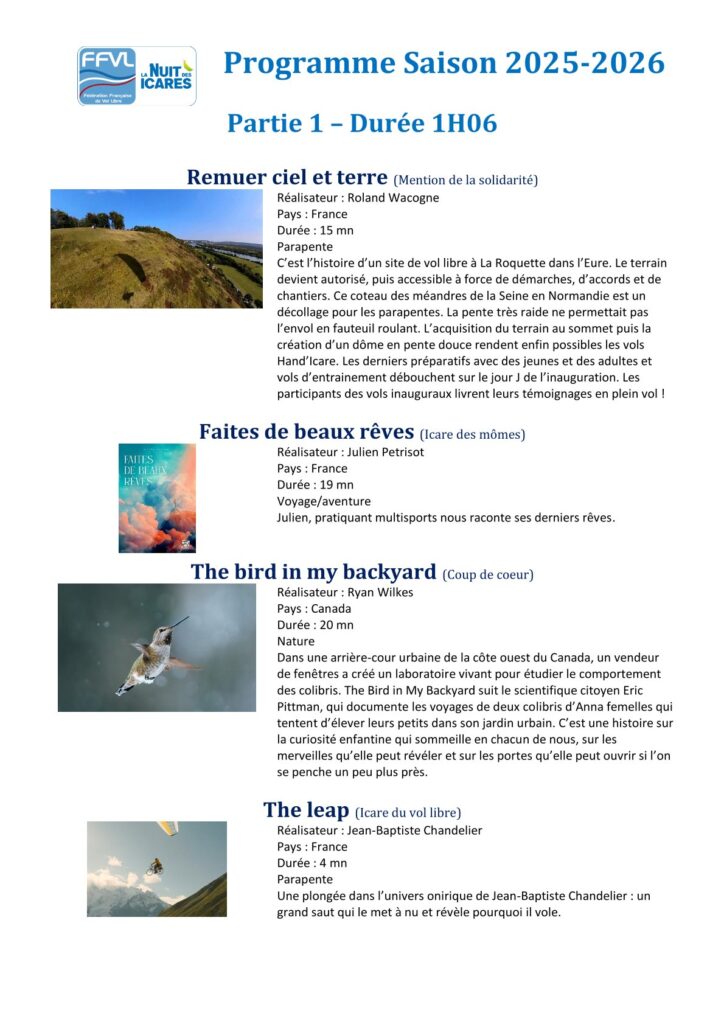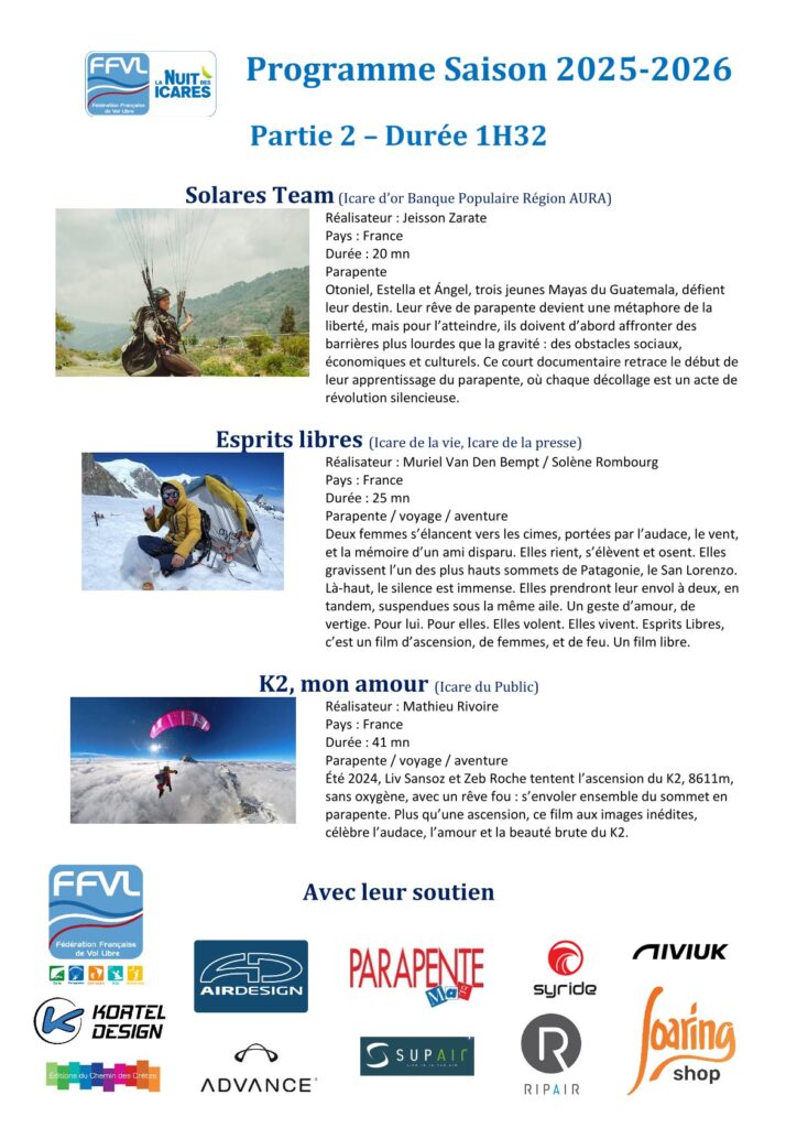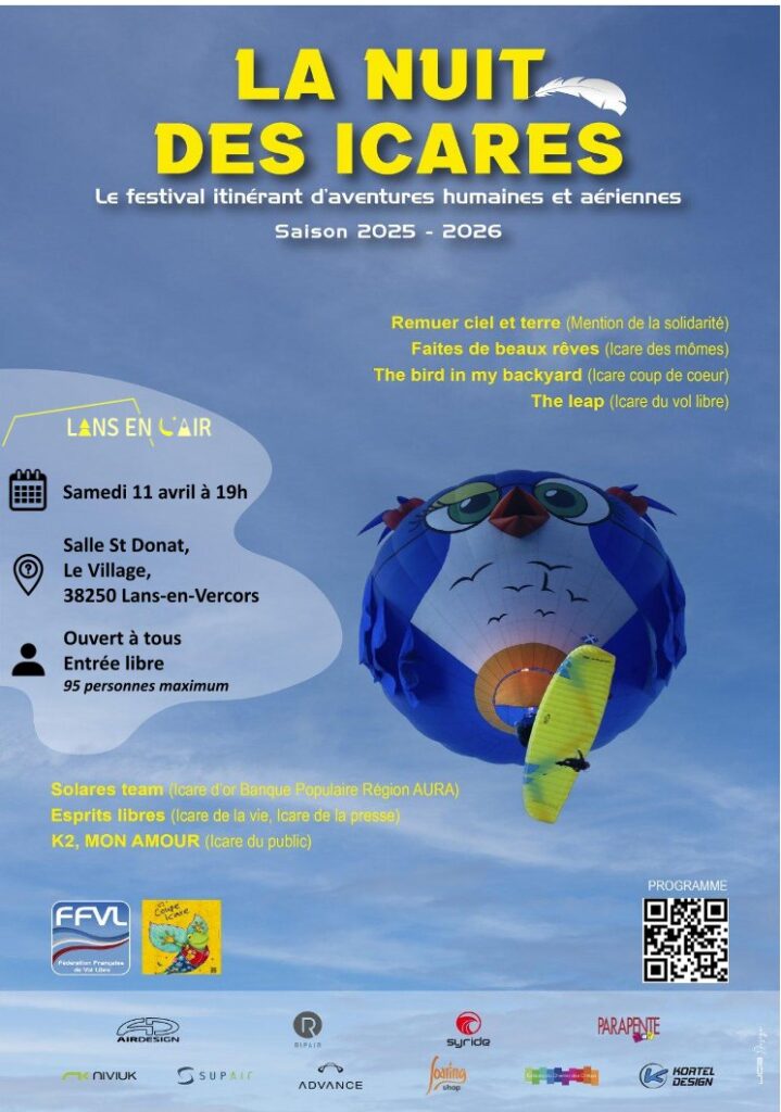Le club de Lans en L’air vous propose une rediffusion de la Nuit des Icares. Plusieurs documentaires autour des thèmes du vol libre, de la montagne, de la liberté, et encore bien plus …